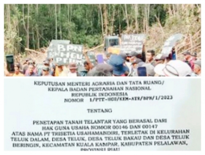 dan Tata Ruang/Badan Petanahan Nasional (ATR/BPN) resmi mencabut izin Hak Guna Usaha (HGU) PT Trisetia Usaha Mandiri (TUM) di Pulau Mendol, Kecamatan Kuala Kampar, Kabupaten Pelalawan. Pencabutan izin ini tertuang dalam Surat Keputusan Nomor 1/PTT-HGU/KEM-ATR/BPN/I/2023 tanggal 24 Januari 2023.